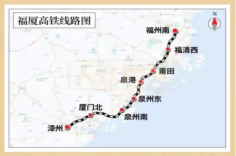 福廈高鐵線路北起福州市,南至廈門和漳州市,全長(zhǎng)277.42公里,設(shè)計(jì)時(shí)速350公里,共設(shè)福州南、福清西、莆田、泉港、泉州東、泉州南、廈門北、漳州8座車站。